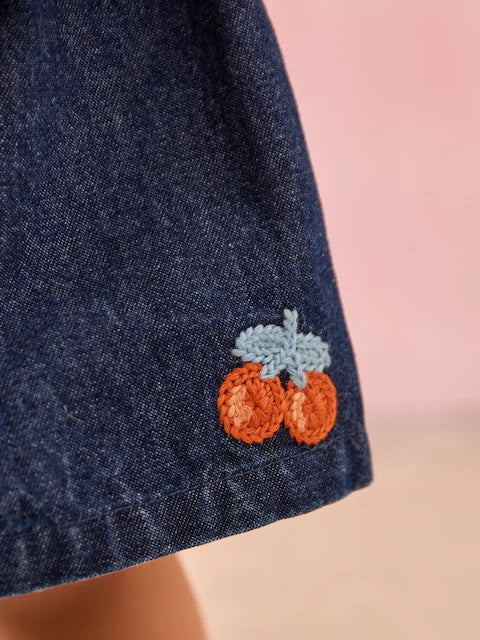 Add a sweet touch to her summer style with this cute and fruity top and shorts set. The two piece set features a strappy rainbow stripe top with an embroidered fruit section across the chest with scalloped edging and button detail. The top comes with a pair of soft dark denim shorts which boast a fully adjustable waist and are finished with cute cherry embroidery.